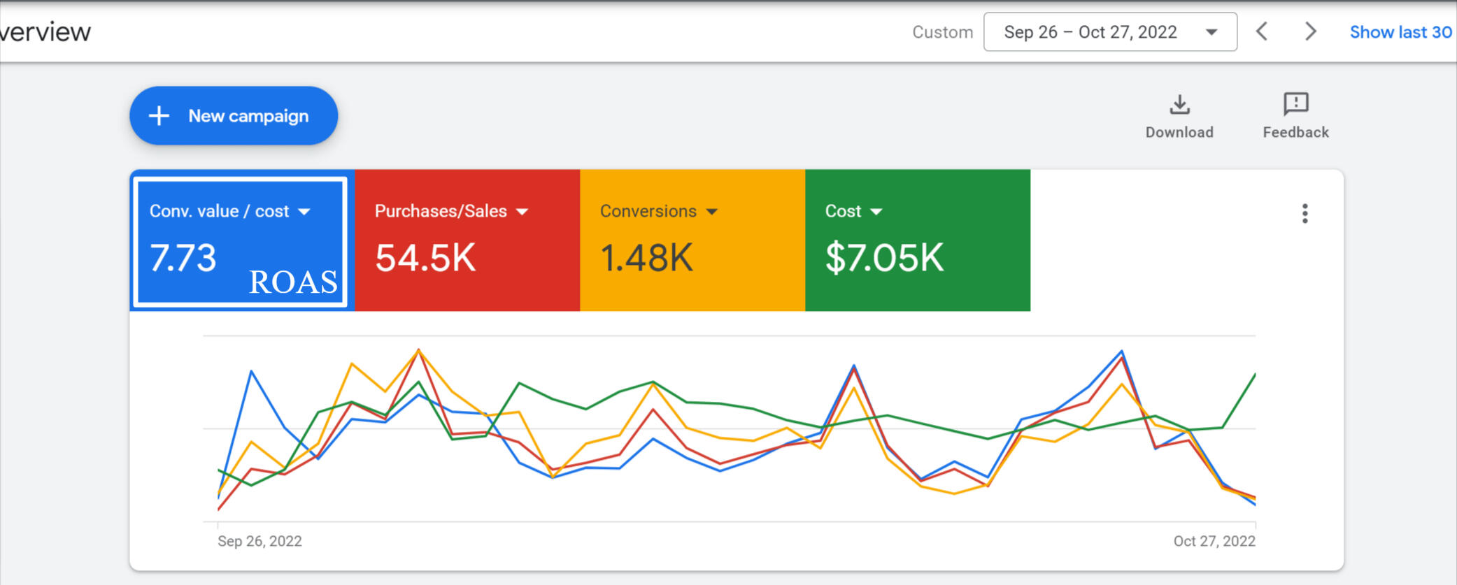7.7x+ ROAS. $54.5k+ return in one month (Google Ads):